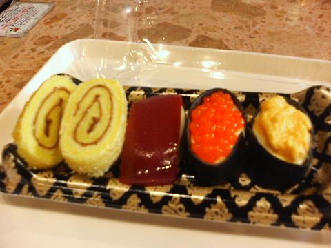 そっくりスイーツミュージアム | 浪花餃子スタジアム こっちではやっているようだ。 春にナンジャタウンでやってたときに行ってきたんですが、もっと派手にやってるのかと思ったら ひっそりと売り場があるだけでした。 まあ、そんなにスペースないししょうがないか。 餃子風アップルパイ まずくはなかったけど脂っこかったです。 明太子風ストロベリークッキー ちょっといちごパウダーに酸味がありました。クッキーはかたい系。 私好みの味でした。 たこ焼き風シュークリーム たこのかわりにナタデココが入ってます。甘すぎ ![]() なにせソースの変わりにチョコなんで…鰹節もチョコだったかも。 いくら丼風プリン 下がミルクプリンでプチプチしたいくらの部分が…忘れた ![]() 杏味だったかなあ? カツ丼風ロールケーキ 衣の部分なんだっけ?衣の下はロールケーキで、ソースはチョコ。 キャベツはアーモンドだっけ? 甘すぎず、私好みでした。 おにぎり風ロールケーキ 三角なだけじゃん。 お寿司風ケーキプレート これ目当てでこのイベント行ったんですよ。 ただ、あまりにも甘かったことしか思い出せない… 思い出したらまた書きます。
